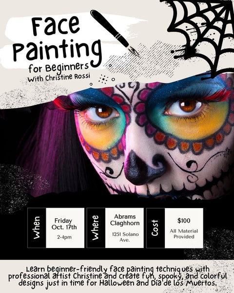 Its almost that favorite time of year in the Bay Area! Halloween and El Dia de los Muertos!Do you try every year to face paint yourself or your kids and end up with less than stellar results? Make this year special! Learn some basic Face Painting techniques and the best materials to use to achieve some happy results! Christine will share some special shortcuts and materials to use to get scary and fun faces this Halloween!Open to all budding face painters...no experience necessary. Children under 14 must participate with an adult partner. Materials will be provided. And puchasing suggestions will be offered.